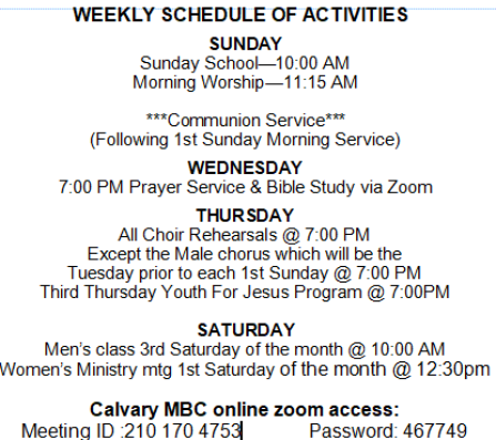Calvary is a faith based church located in the heart of downtown Mount Clemens. We believe not only in serving Our Lord Jesus Christ but also the community through our Outreach Committe.If you are looking for a warm inviting church home, Calvary is the place.Stop by and enjoy our Sunday School, Worship service or join us on zoom for Bible Study.You can also catch our Sunday Worship service on zoom.